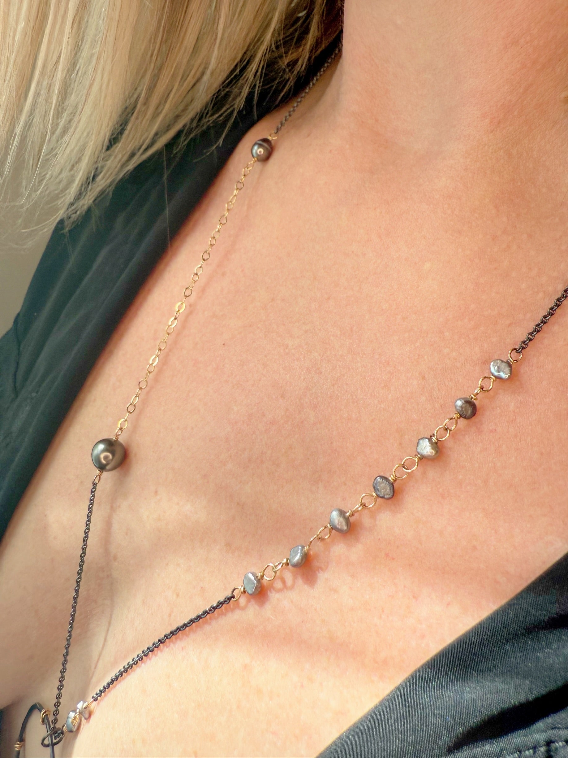 Short Description: A captivating boho fringe necklace featuring a blend of Tahitian and freshwater pearls with oxidized sterling silver and 14K gold fill accents – mindfully made for a free-spirited and elegant statement.