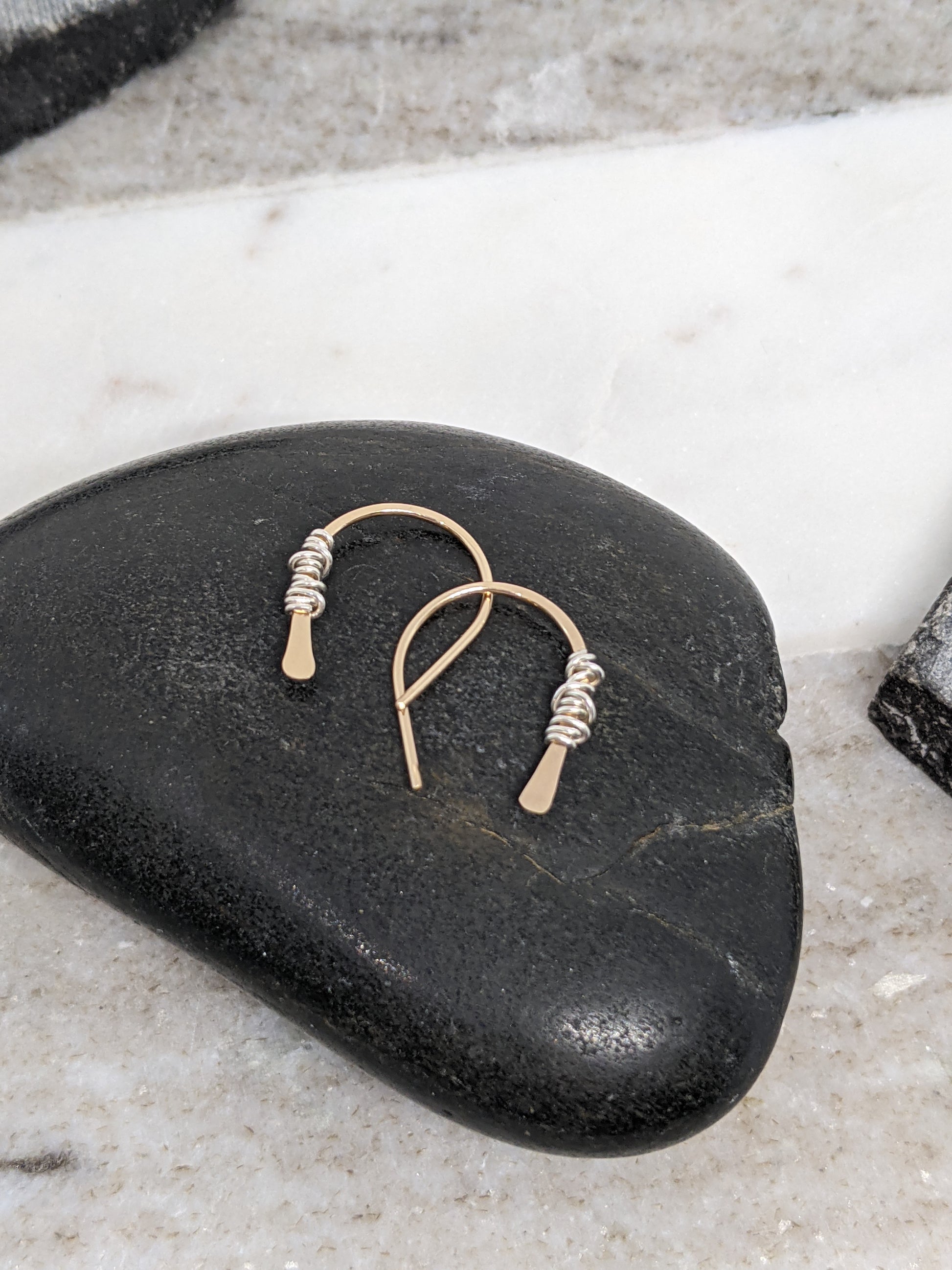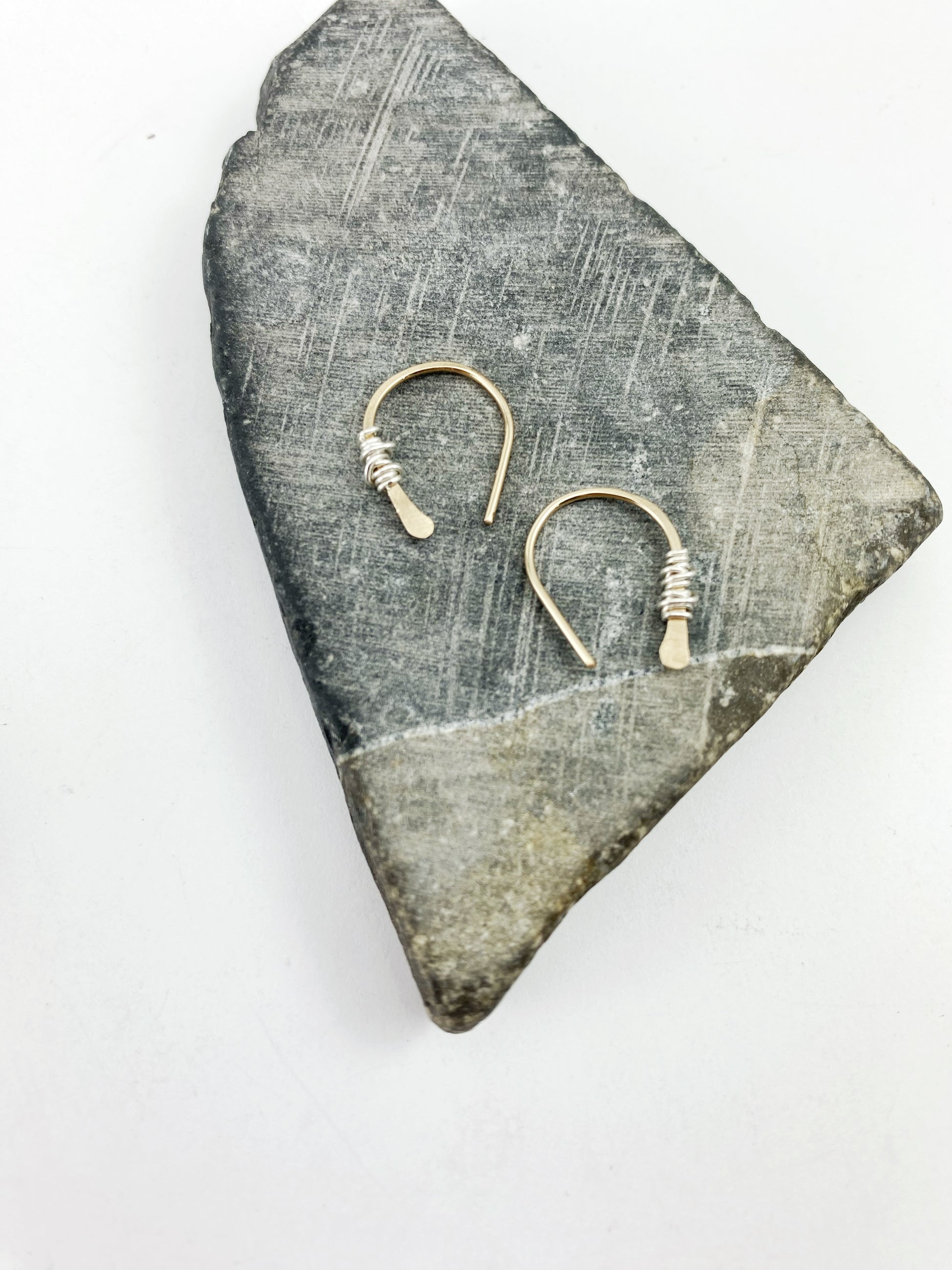 These stunning earrings feature a delicate horseshoe shape, meticulously hand-forged from gleaming 14k gold fill. The hand-wrapped 14k sterling silver wire adds a touch of warmth and modern contrast, creating a piece that is both symbolic and effortlessly stylish.