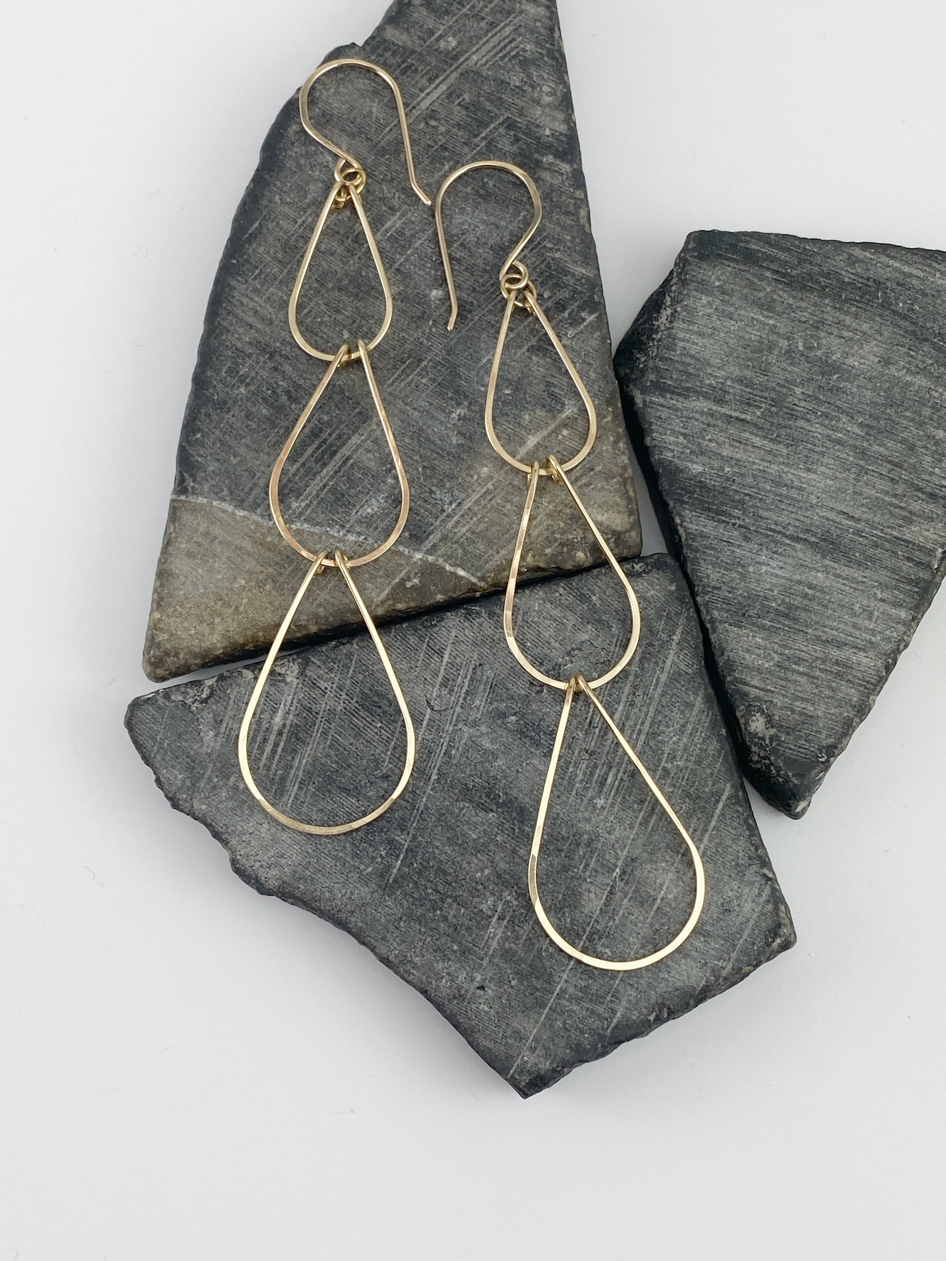 Triple Waterfall Earrings: These elegant earrings cascade like a gentle waterfall. Their fluid design in 14k gold fill embodies the beauty and strength of a mother’s spirit.