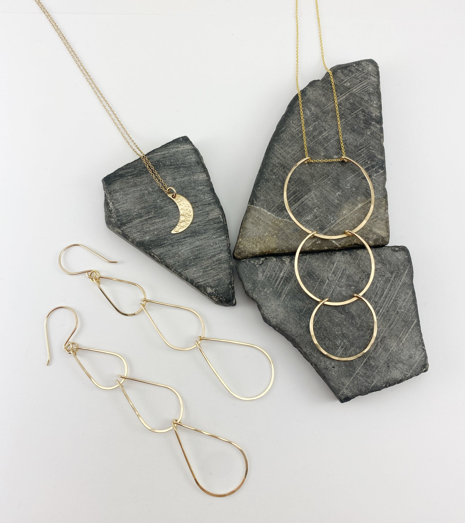 Rachel's everyday trio set features the Lace Moon necklace from her grandmother's hand-tatted lace, layered with the Supernova necklace symbolizing her family and complimentary Waterfall earrings. These are my three absolute favorite pieces that I wear every single day! Each piece is crafted in 14k gold fill.