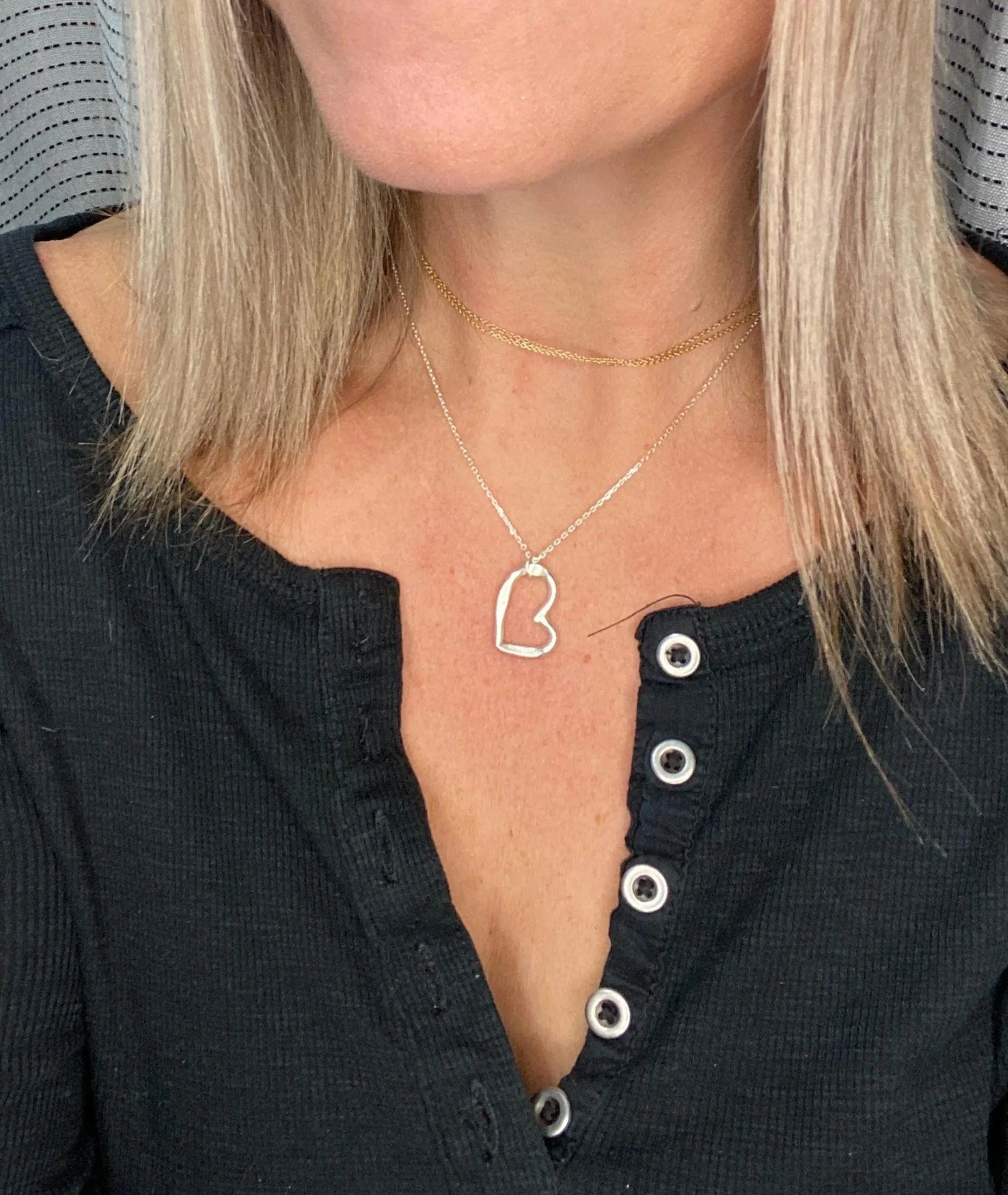 This delicate necklace features an asymmetrical shaped sterling silver heart, that hangs from a shimmering silver chain. The minimalist design exudes timeless elegance and adds a touch of sweetness to any outfit.