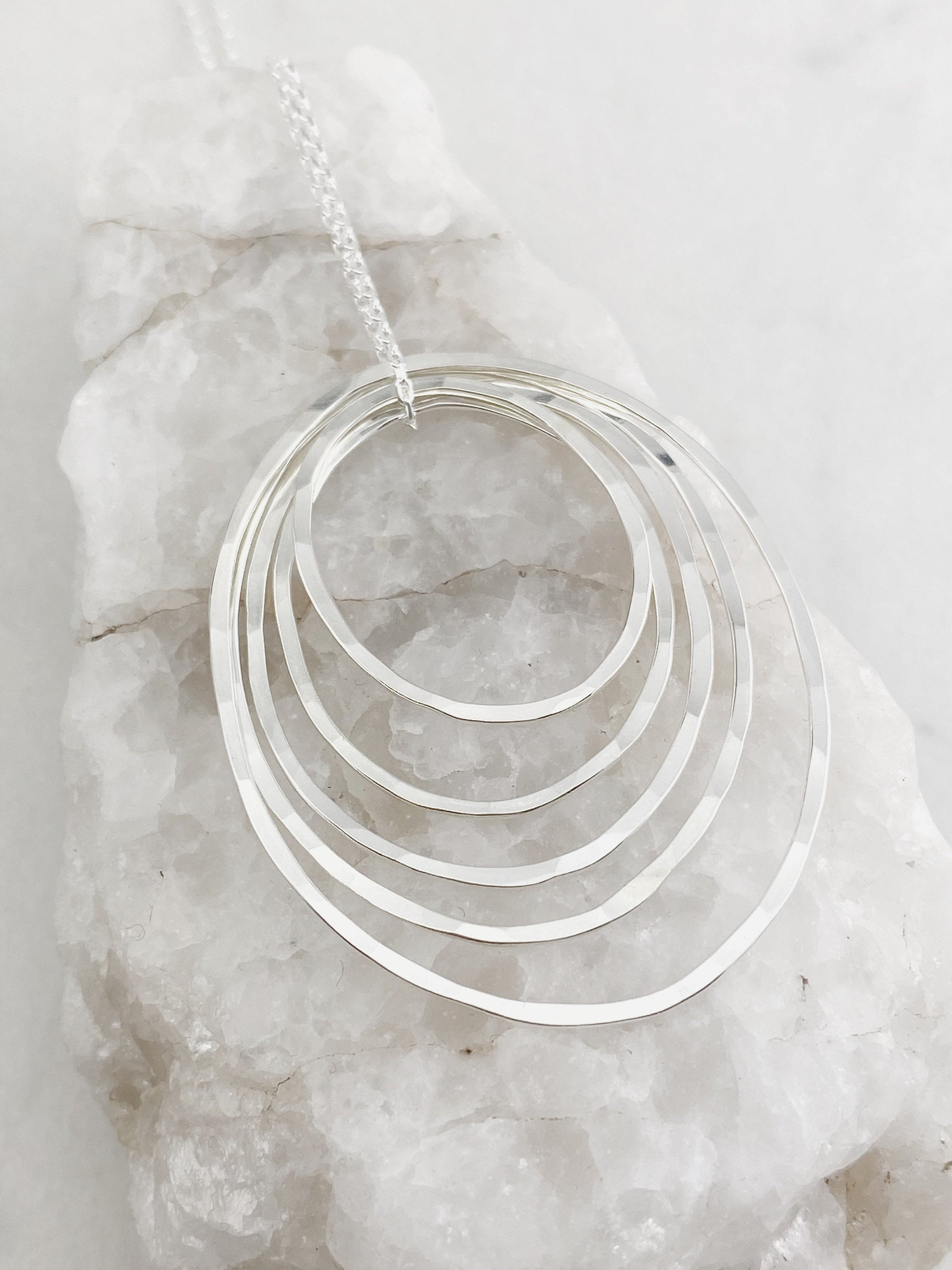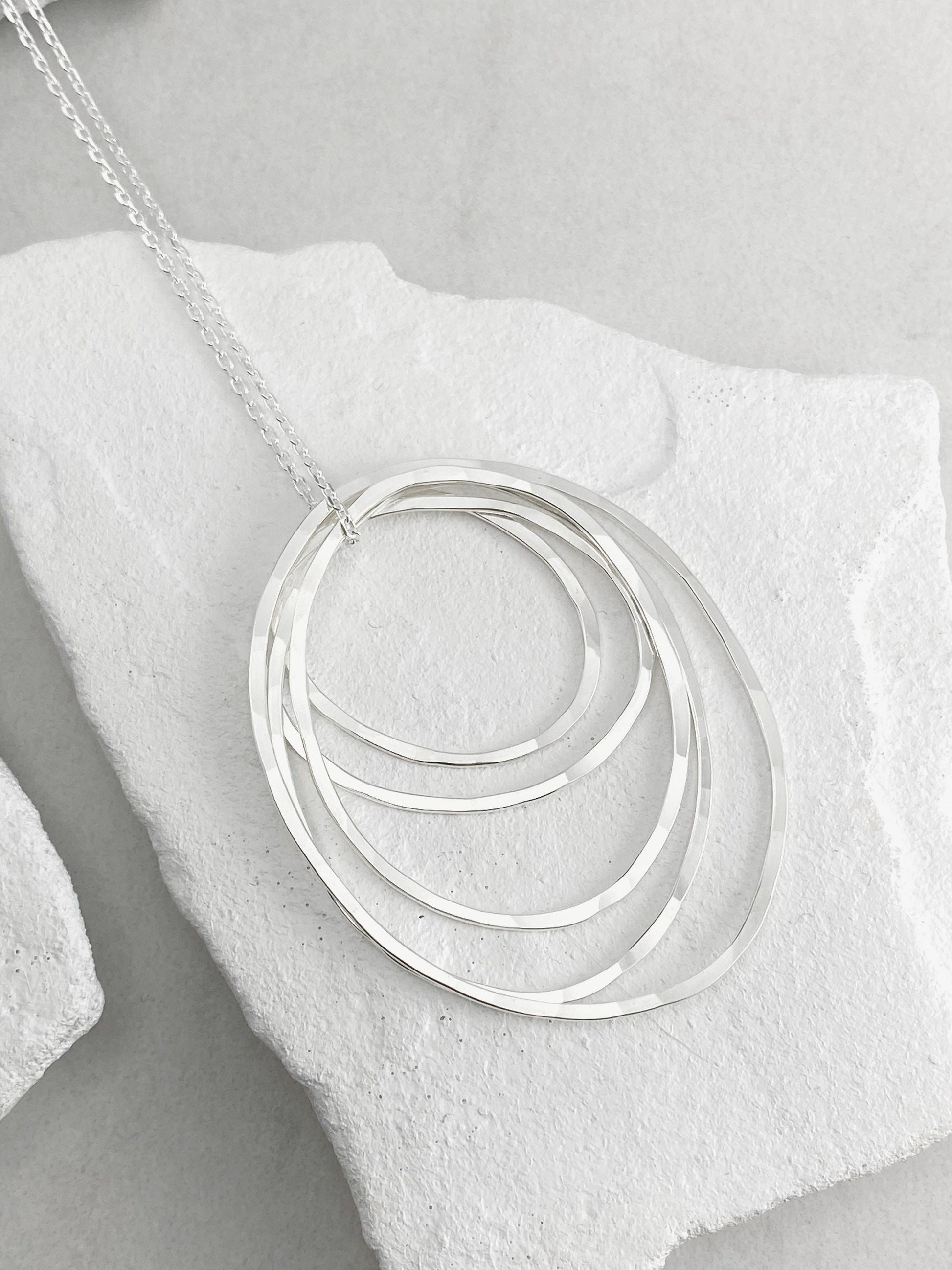 Five individual hand-forged sterling silver rings create this kinetic necklace. Measuring in at a little under 2" in diameter, this pendant comes with a 16" 18" or 20" chain. It will be a staple piece loved by its new owner. Your pendant will arrive in a custom jewelry box topped with a bow ready for giving (or keeping)!